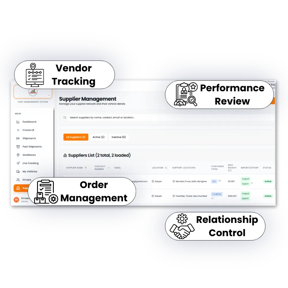 Simplify your procurement and supplier operations with robust supplier management features. Track supplier performance, monitor deliveries, and maintain accurate records of all transactions to ensure timely and reliable supply chain operations. By centralizing vendor information and order histories, you can identify high-performing suppliers, address delays, and strengthen relationships. This feature enables efficient communication, better accountability, and informed decision-making, helping businesses reduce operational disruptions, optimize supplier interactions, and maintain a smooth, cost-effective fleet management process.